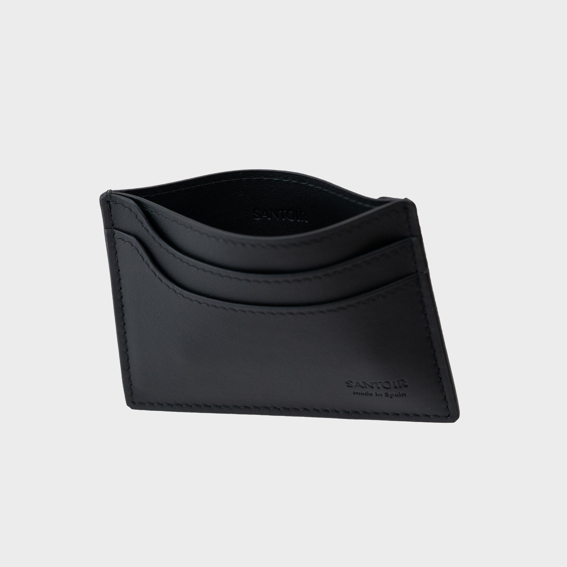 Un tarjetero delgado definido por una sutil onda asimétrica en el frente: un objeto cotidiano refinado hasta lo esencial, hecho en suave piel napa de becerro de plena flor para un tacto elegante y un transporte liviano y compacto.