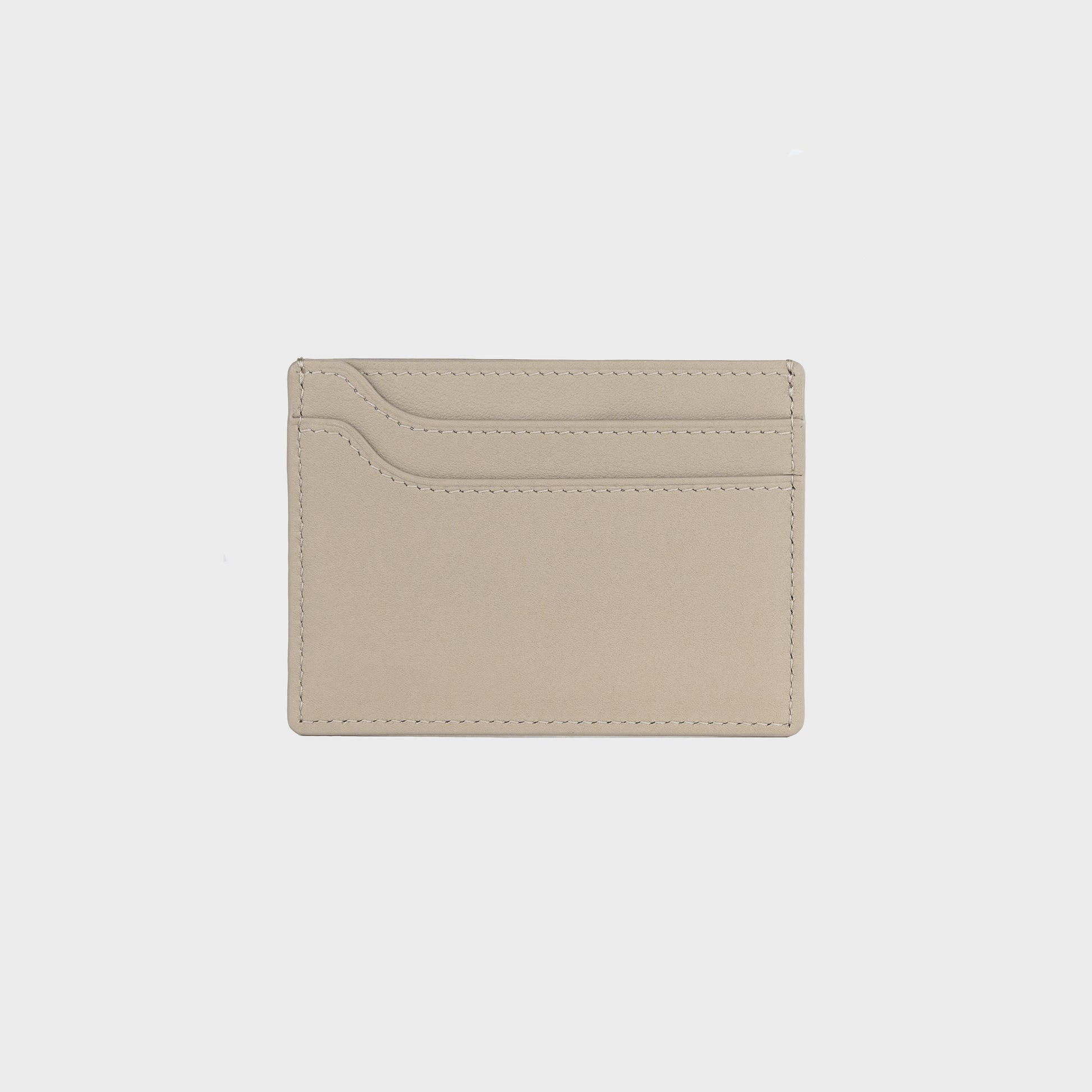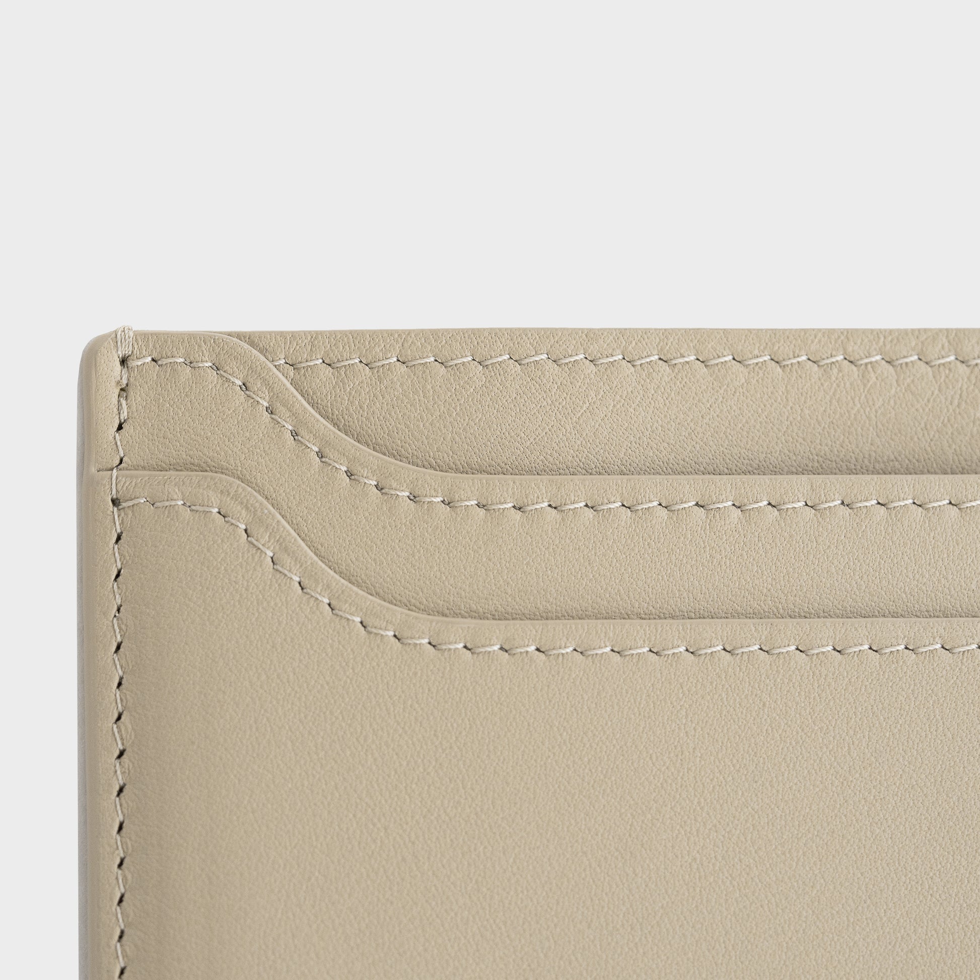 Un tarjetero delgado definido por una sutil onda asimétrica en el frente: un objeto cotidiano refinado hasta lo esencial, hecho en suave piel napa de becerro de plena flor para un tacto elegante y un transporte liviano y compacto.